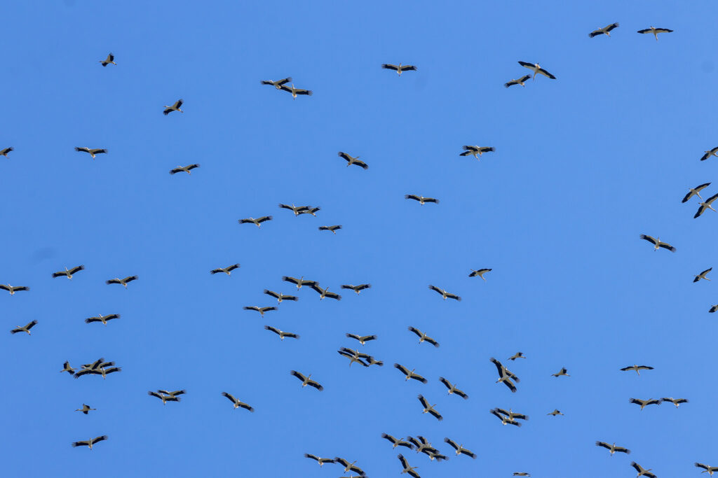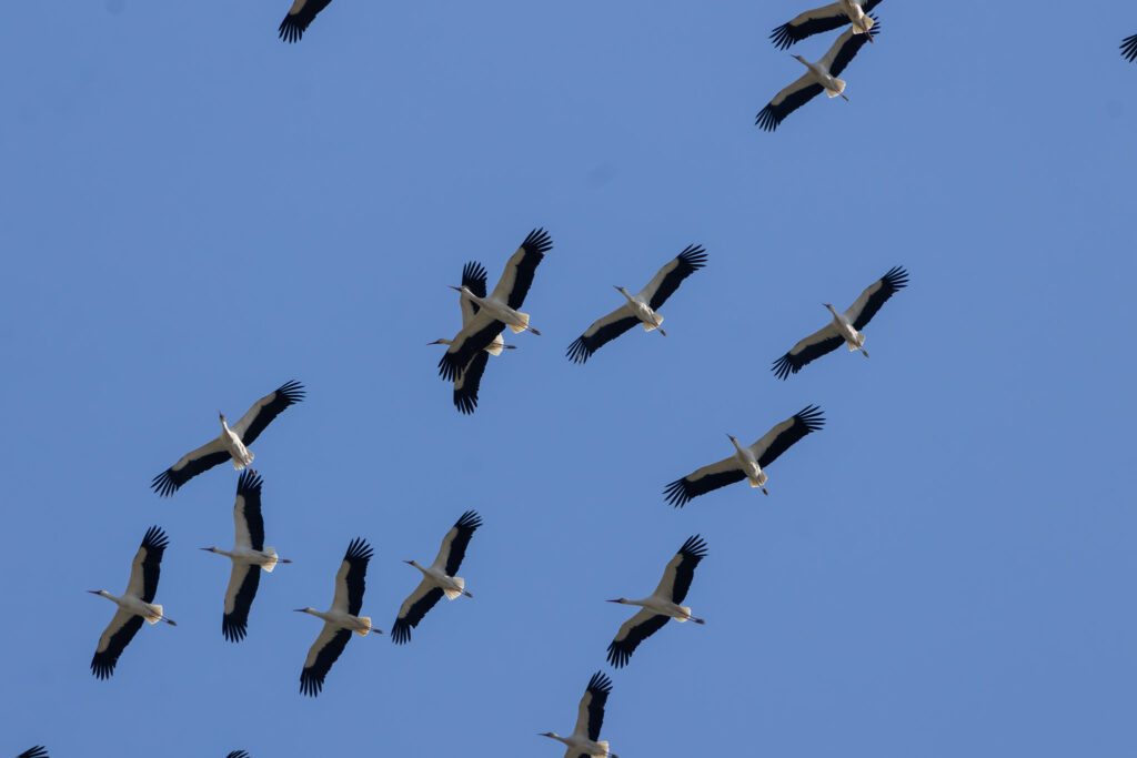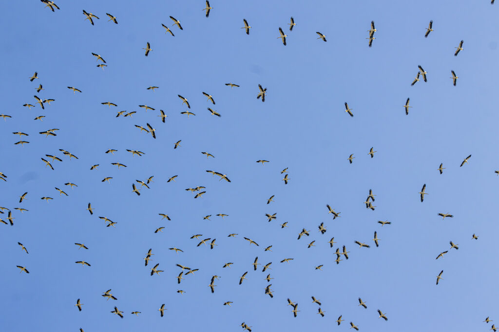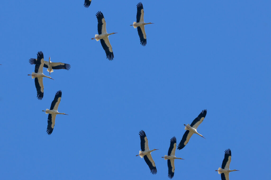 שני סיסי הרים מסתחררים בתרמיקה, כמו שני גולשים שנלכדו במערבולת. הם נאבקים בזרימה ואז נכנעים לה, נמשכים אל לב התרמיקה ונפלטים מצידה השני. שלוש ארבע חבטות כנף והם מתרחקים מהחסידות, מנמיכים ומצטרפים לסנוניות המערה והרפת שצדות מעל לשדות התלתן. סיסי חומות מסתחררים סביב לתרמיקה, משרקרקים. מעופם הקליל לועג לכובדן של החסידות. נץ מצוי מגיח ומנסה את מזלו. ירגזי פותח בסדרה של קריאות אזעקה עולות ויורדות, מצווחות. הן דורכות גם את גופי המורגל לעייפה. הסיסים מתמרנים ומתרחקים מהנץ והסנוניות מתחמקות ונעלמות. הצוצלת נדרכת, אך הנץ ממשיך בדרכו ונעלם. היא שוב נרגעת. כמה חוויאים מצטרפים מדרום. הם רוכבים לצד החסידות על הרוח שמתחממת ומתחזקת, דוחקת את החסידות מערבה, מאפסנת את שרידי התכול בְּבוֹיְדֶּעם שמימי, ומזמינה עוד ועוד אובך שמחליף את הכחול ועוטף את חולדה. שלוש דיות מנסות לנווט את דרכן באובך ובאבכת החסידות, שמוסיפה לפעום כלב; להתכווץ ולהתרחב, להתפשט ולהתדלדל, להזרים חסידות אל מרחבי המרום. עשרות חסידות ניתקות מהתרמיקה הנסחפת וגולשות צפון מערבה. הלבן והשחור של אברותיהן מתעמעמים מעט באובך. ועדיין מצטרפות עוד חסידות אל התרמיקה שנחלקת לשתיים ולשלוש. שלוש אבכות מיתמרות עכשיו מעל חולדה וחסידות עוזבות את האחת ומצטרפות לשנייה באותה ערבוביה פועמת וגולשת.