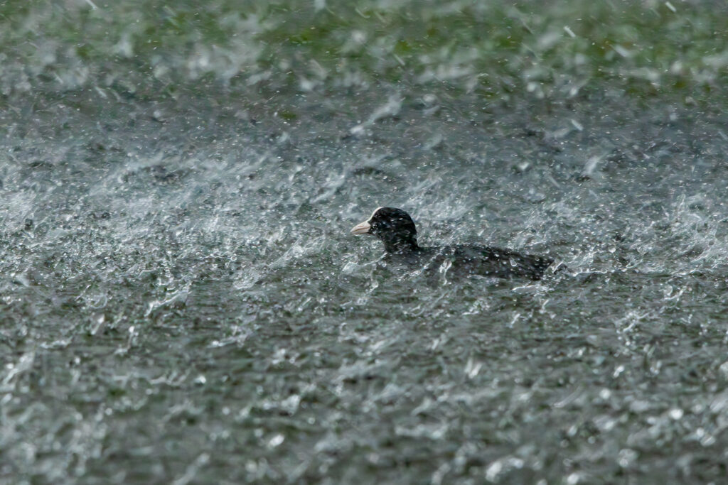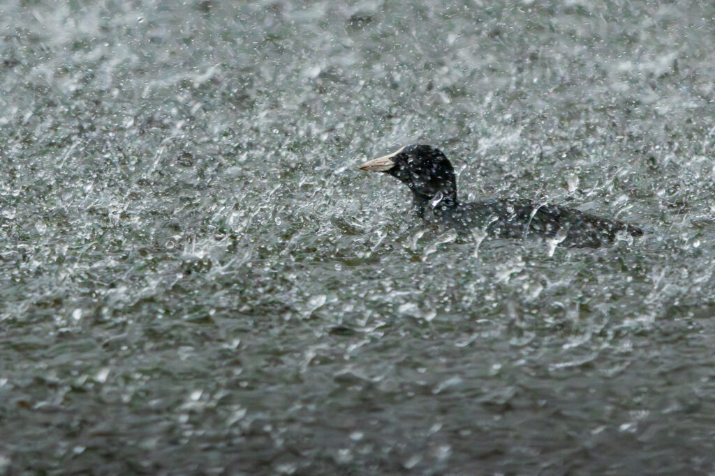 השמש אינה מצליחה לחדור את מסך העננים, אך אורה מתאבך דרכם ומתחזק. פוגע בבניינים שמקיפים את העמק וחוזר כהשתקפויות שצובעות את הבריכה. גם גווני השלכת הנחושתיים מרקדים על פניה. זכר מרית חוצה את כתמי הצבע ושתי נקבות מלוות אותו, במאסף. צווחות של תוכים נזיריים שמנצלים את ההפוגה ונוחתים על העצים, לאכול. העורבים שבים לריבים הבלתי נגמרים שלהם והסיקסקים ששים לנער מעליהם את הטיפות ולהצטרף. שחרור שר ושירתו מתרבדת מעל פני המים. מתוקה וכמעט שמשית. אדום-חזה מצטרף אליו. לרגע ניתן לשקוע בשירה, לשכוח מהסערה. אך עוד ברק מבזיק ועוד רעם מתנפץ וגיעגועי הברווזים והטיפות היורדות בעוצמה ובצפיפות שהולכת וגוברת. ענף נשבר ומועף ברוח, מעורר בהלה בקרב השרשירים. הגשם מתחזק וחודר למסתור. אני נרתע אל הקיר האחורי ולובש חליפת סערה. אפילו הברווזים נכנעים, נסוגים לגדה ומתגודדים עליה. גם האגמיות והטבלנים. הגשם הופך לברד, כדורים קטנים ואז גדולים. חובטים במים, מועפים בעוצמה אל תוך המסתור, מכים בקיר ובי. מרית אחרונה ממריאה מבוהלת ונעלמת. כמעט כל הברווזים והאגמיות נעלמו, לא ברור לאן. רק אגמית בודדה נשארה והיא נלכדת בסערה. כדורי הברד מוטחים סביבה, חובטים בה. הבריכה הפכה לים סוער בזעיר אנפין. קווי המתאר של האגמית מאפירים, מופיעים ונעלמים מבעד לגשם הזלעפות ולכדורי הברד. היא מבוהלת, מנסה להמריא ונכשלת. בלית ברירה היא ממשיכה לשחות, לנסות ולצלוח את המים הגועשים ואת מכות הברד. להגיע אל מבטחי הגדה. היא מופיעה ונעלמת מבעד לטיפות, לרסס, לברד, לגלים שנוצרים מפגיעות הברד במים.