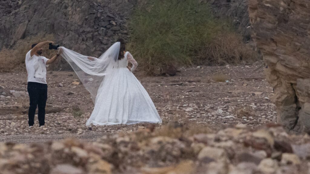 המדבר נפתח סביבנו והנחל סוגר עלינו ואותנו לחיבוק. מעלינו מתאמצת השמש לטפס אל מעל לצפחות, להפציע מכיסוי העננים הסגרירי ולהאיר את היום האפרורי. כמה מקרניה חומקות ונוגהות עלינו כהילה, שורות בין שנינו כִּשְׁכִינָה שירדה מטה, ומכשפת אותנו—אין לי שום הסבר אחר—כי לפתע מופיעה ביננו, בלב המדבר, כלה כלילת לובן, מלווה בפמליה מלאה.