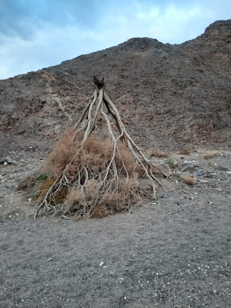 מהקרקע עולות פתילות מדבר, מחוללות השמיימה כסנה לא בוער. אזוביונים פורחים בדלילות ובדלות מדברית. עץ יבש שנסחף במבול עתיק יומין, נעצר על ראשו. גדמי שורשיו בשמיים וענפי נופו נטועים כחופה הפוכה, נעוצים בסחופת הצפחה.