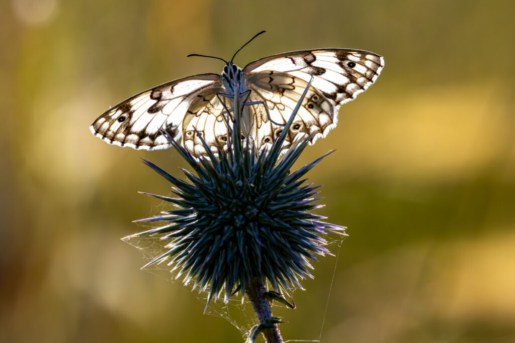 אנחנו מטפסים על הגבעה, בכיוון הצוקית הנעלמה. בתה טיפוסית של סירות קוצניות, אשחרים, סלעי גיר ואדמה שטרשיה מוסווים בוורוד הזועק של דרדרים גדולי-פרח ובלבן הקרמי של אביביות משויישות. עשרות מהפרפרים מרצפים את השביל, כמו אריחי שיש לבנבנים. אוחזים בדרדרים ובקיפודנים, או פורחים לפתע כפתיתי שלג אביבי וחם. מכנסינו צוברים קוצים דוקרים, מגרדים ומעצבנים, אך הנה הכיפה ועליה הצוקית ומבטה המיתמם מפצה על הטרחה המעקצצת. נץ קצר-אצבעות מתעגל מעלינו ופירחוני ירגזי מצייצים סביבנו. שוב השילוב של נדידה ורבייה.