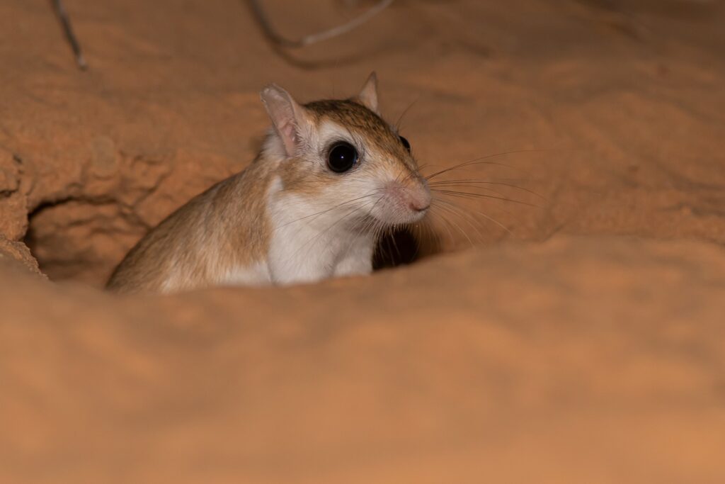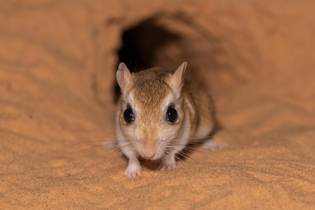 חיפושיות ענק שחורות מוליכות אותנו אל גבעה סמוכה, שם גרביל חולות מציץ ממחילתו. הוא רב משימתי. שורד. בה בעת מעמיק וּמְתַחְזֵק את המחילה, מציץ מתוכה לבחון אותנו, יוצא בריצה מהירה לאכילה חפוזה, מפנה לנו את אחוריו וזנבו, חופר, אוכל, מתרוצץ וּמְתַחְזֵק. הכל בעת ובעונה אחת. הישרדות בסביבה מוכת עכנים ואיומים אחרים. הלילה השחור נבלע בעיניו הגדולות, בתשוקתו לחיות. הוא רץ ביננו, מותיר בחול את עקבותיו הזעירות, שב על עקביו, מוחה את עקבותיו הישנות ומעטר חדשות במקומן. הוא מכרסם במהירות פרי, שב למחילה, חופר בה עוד, מגיח, מעיף עלינו גרגירי חול, נמלט לתוכה שוב, מציץ ומתרוצץ, עומד, רץ ומתיישב, כולו נרגש. רגליו לא פוסקות מעבודה, גם לא לסתותיו, הכל בקצב מסחרר, מואץ, אין רגע לפנאי. שפמו מרטט, זנבו נגרר, אוזניו זקופות, תרות כל רחש ורשרוש. עיניו מחליקות עלינו, בולעות את הלילה ואת תבל כולה.