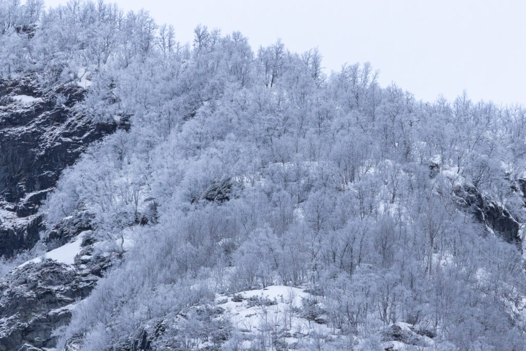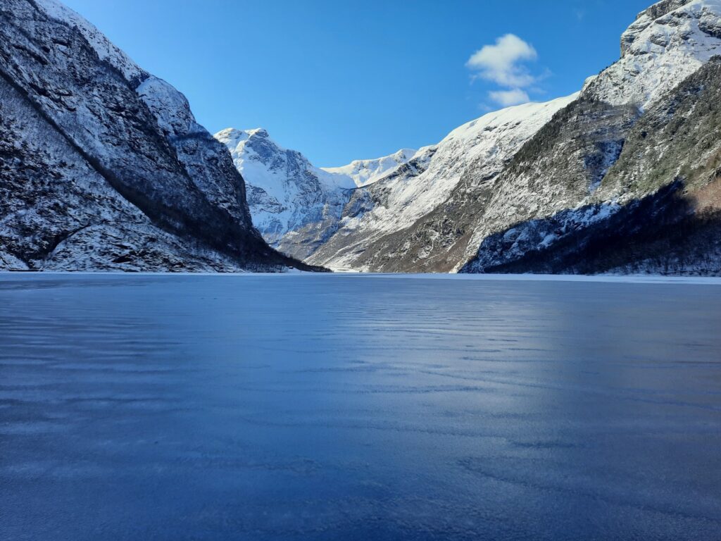 שְׁכוּר קוֹר מתעטף הפיורד באור, מתנער מהחשיכה, שירדה ללוות אותנו בדרך מטה, ברכבת לפלאם. יערות מחטניים בתנומת חורף, מצוקים כהים מלבינים בשלג שבוהקו מתעמעם בדמדומי הערב והליל, שברירי כפרים מוארים, מפלים קפואים; מהקור עצרו המים ממרוצתם. הגענו לפלאם באפלה, מוקפים פתיתי שלג רוחפים ודומיה. נצנוצי השתקפויות העידו כי באפלה פה יש פיורד. ואכן נעורנו לנשף של ים, צוקים ולהבות שלג לבנות.