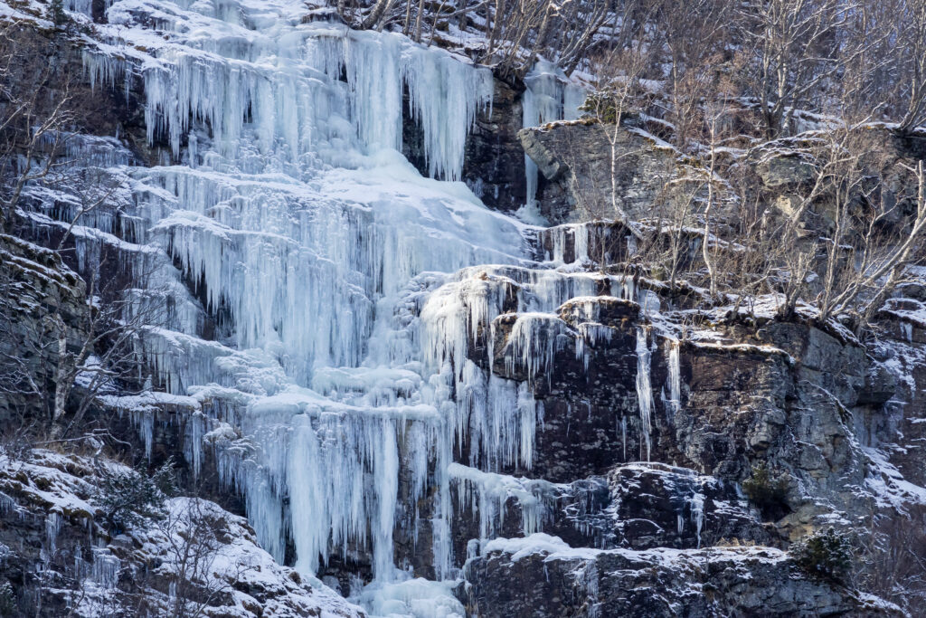 פסגות הצוקים, שתוחמים את הפיורד הצר, מתלטפות בעננים מוכיים, רכים וריקים לאחר שהמטירו בלילה את מטען השלג, שהכביד עליהם. מימי הפיורד כהים כמעט שחורים, או–כתלות בנפילת האור על פניהם–תכלכלי צינה והשתקפות. העננים משייטים בשמיים ובמים, גם הכפר ובתיו הצבועים והקמרוניים, עומדים על ראשם במים הקרים. עולם של יופי קפוא וכפול. על הצוקים עצים מוכי קרה, שנאחזים בסלע כנגד כל כוחות הקיום–רוח, שלג, מפולות–ויוצרים יער דליל וזקוף. בין לוחות הסלע התלולים מלבינים מפלים שמימהם עמדו מזרום, קפאו בנפילתם, כל מחוותם תדהמה ועלבון על שנעצרו בדהרתם מטה, להיאסף אל מימי המפרץ. גלדי קרח, חלקם מגירים טיפות, שנבלעות בלי קול במעטה השלג, מנצנצים כצלצלי קריסטל בקרני השמש החיוורנית, מגבירים את אורה לסמא את העין. דממת צינה, שמופרת רק בגריסת השלג בנעליי.