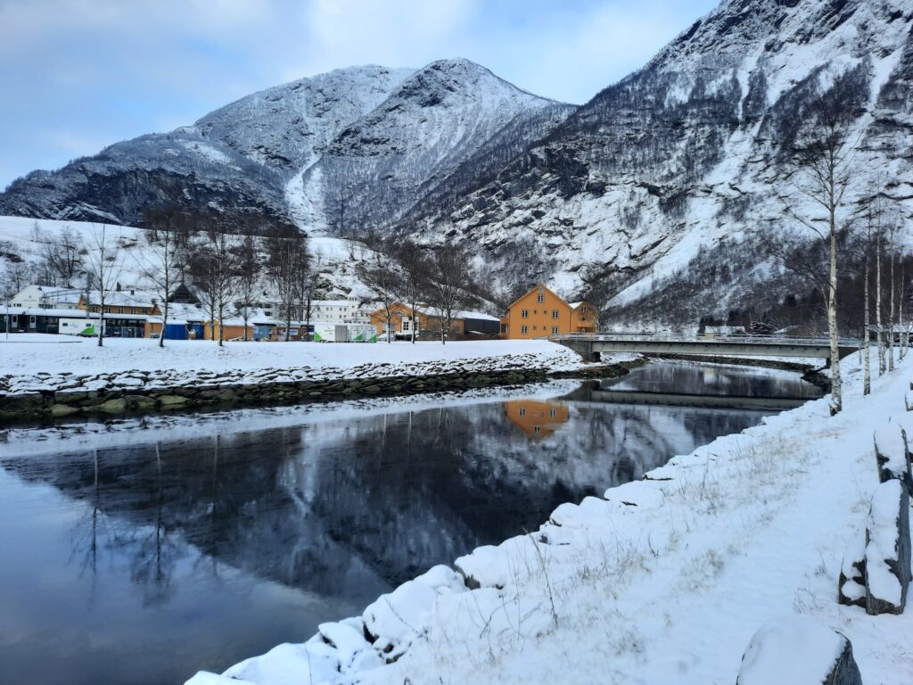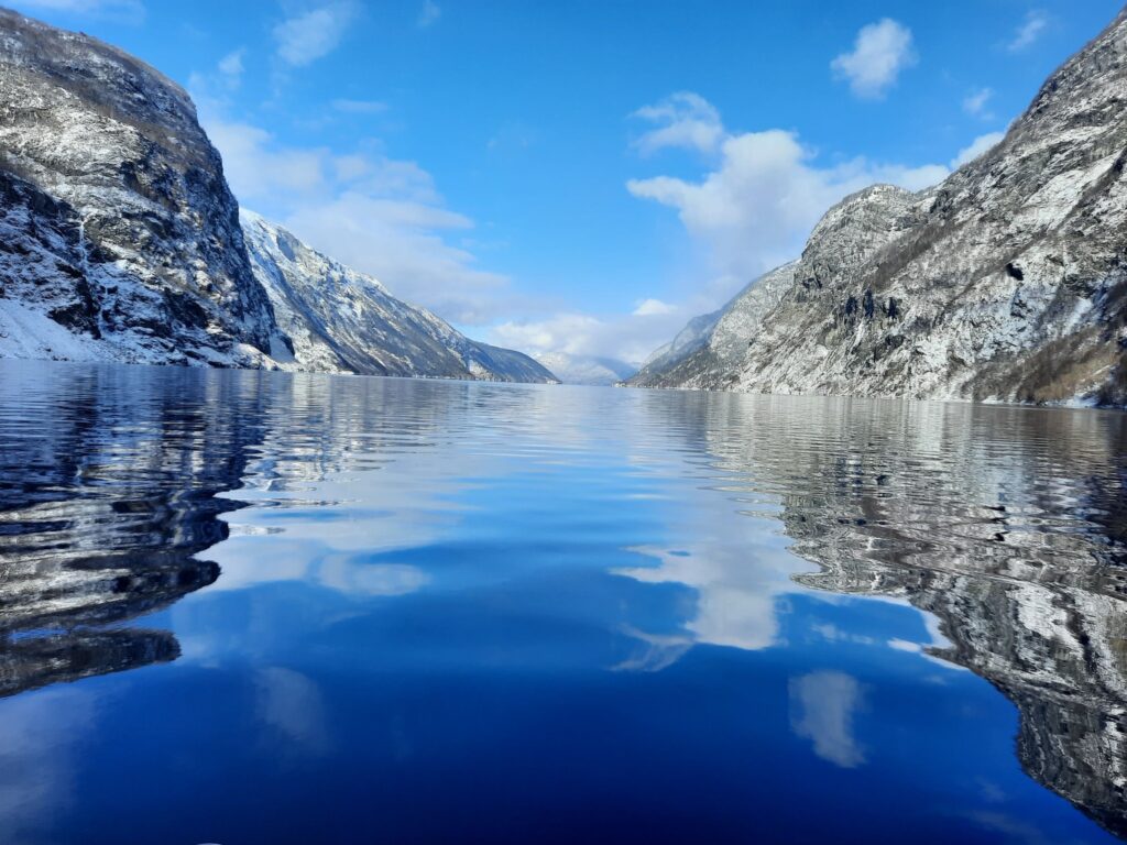 מימי הפיורד כהים כמעט שחורים, או–כתלות בנפילת האור על פניהם–תכלכלי צינה והשתקפות. העננים משייטים בשמיים ובמים, גם הכפר ובתיו הצבועים והקמרוניים, עומדים על ראשם במים הקרים. עולם של יופי קפוא וכפול.