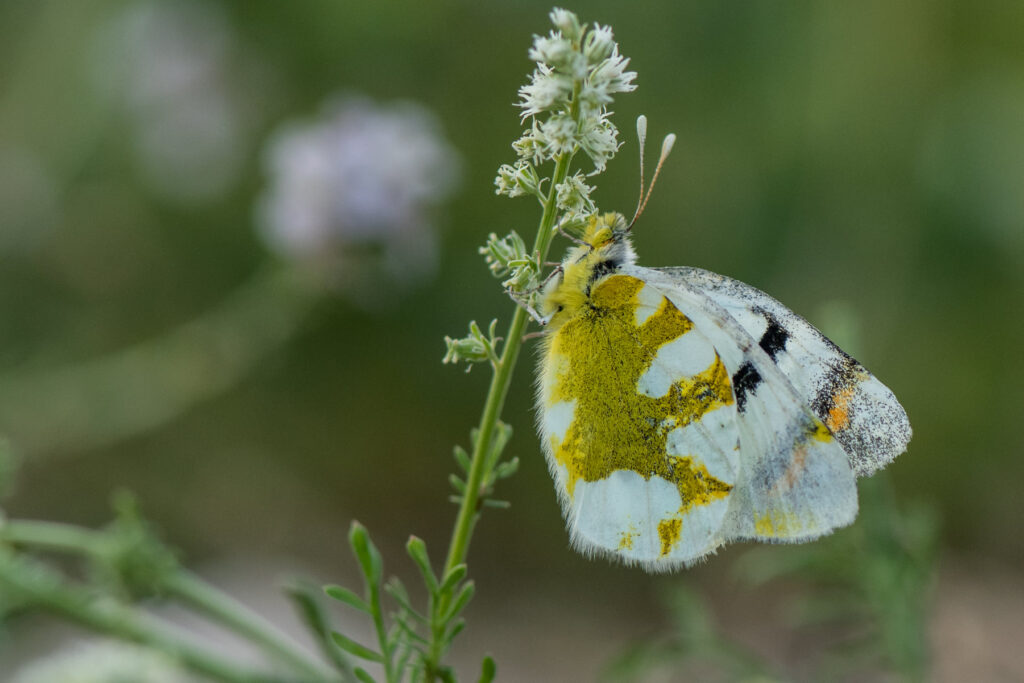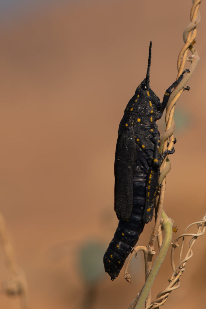 אנו שבים אל המכונית, דרך זוג שרקרקים גמדיים שיופים עושה אהבה עם עץ שיטה ומתקשרים לאלדד ששמח להצטרף אלינו לתה ופרפר בקליה המחשיכה. כתום-קצה מדברי קוראים לתשוקה העכשווית שלנו ואנו תרים אחריו בכתמים המקלישים של המנתור. מושית נחבאת על דגן, מוקפת בעינפזים קלילים וירקרקים. השמש יורדת להסתתר מאחורי מצוק ההעתקים והאור שב להיות רך וענוג, אור עצלתיים שמתאים לנו, אם רק נאתר כתום-קצה בתום היום. לבנין הרכפה כבר נרדם על רכפה, חובק את הגבעול הצר ברגליו הקטנטנות. עש מעופף, חגב קופץ ומיכה כמעט ודורך על כתום-קצה ישן. שלושתנו חגים סביבו, עגים לו מעגל, רוכנים, שוכבים, מצלמים, והפרפר בשלו, הוא ישן, חולם על היום שהיה לו, על היום שנותר לו: שארית חייו המהירים בצילו של המדבר האיטי ובצילם של כמה צפרפראים, שיומם עבר בעצלתיים מדבריים, בין סבכי-גרון ובינו.